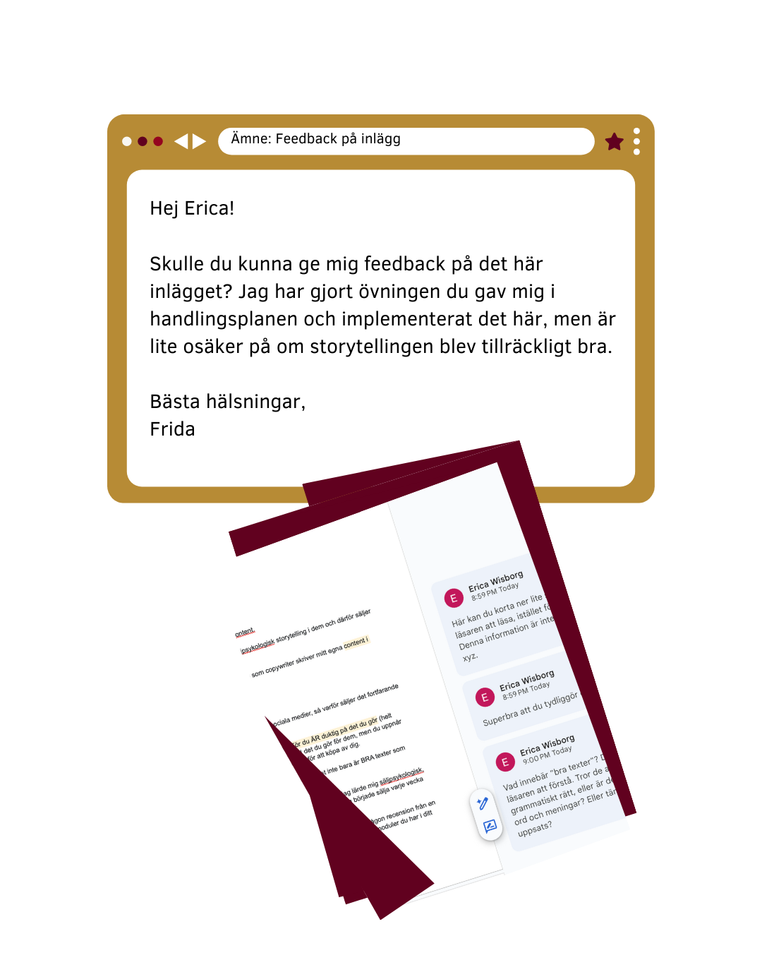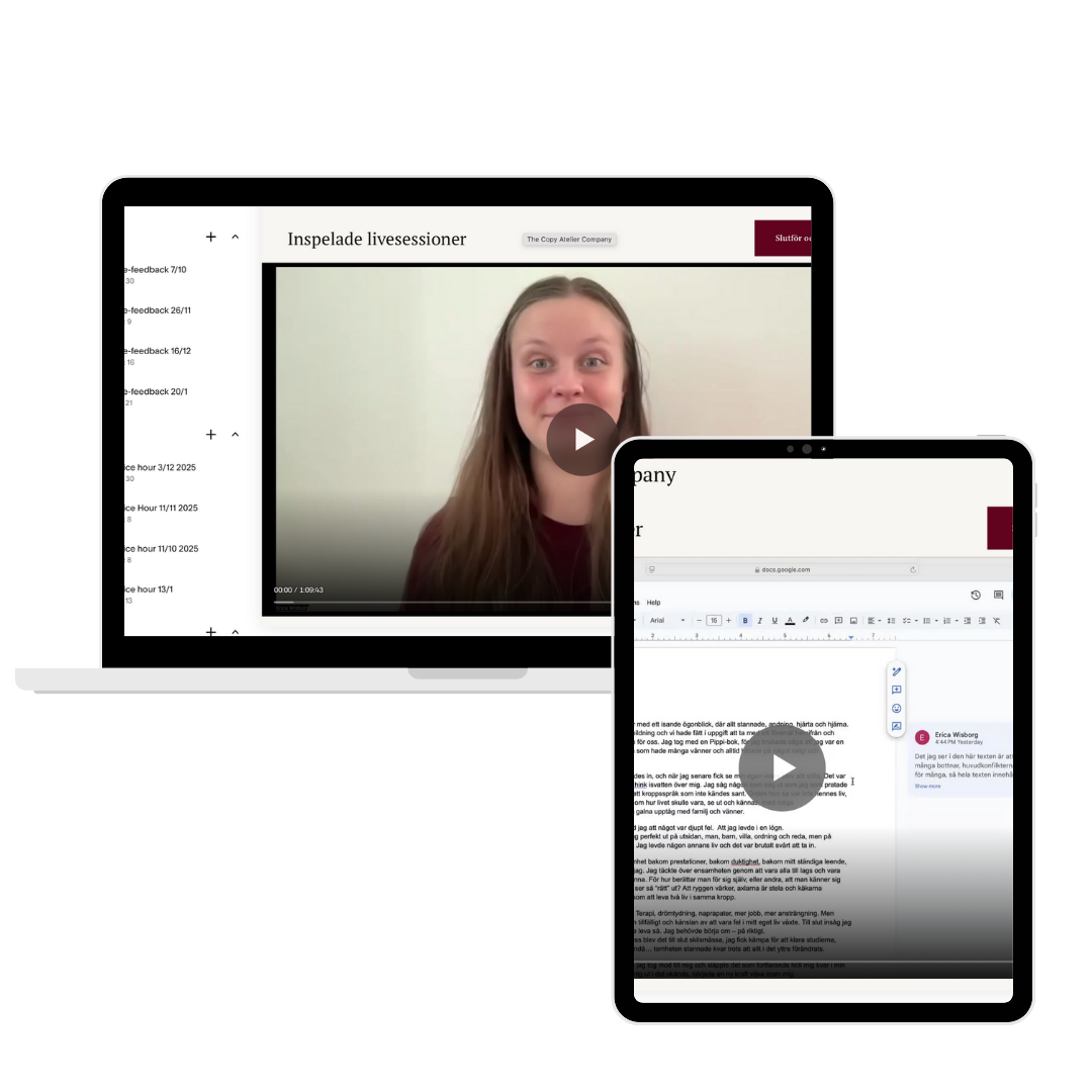 Du får personlig feedback skriftligen av mig i ett Google Dokument - men jag kan också komma att spela in en Loom-video till dig där jag ger feedback, om den är mer djupgående.